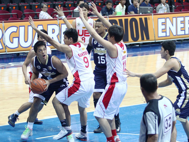 Jeoffrey Javillonar (left) runs into a wall of defenders, UE's Adrian Santos and Chris Javier. Jeff Venancio