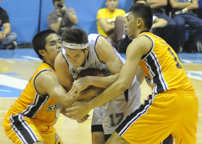 UST's defense (Jeric Fortuna, left and Kevin Ferrer, right) kept the Adamson mainstays like Rodney Brondial (center) in check, but guys like Jericho Cruz still stepped up to make it a tight game. KC Cruz