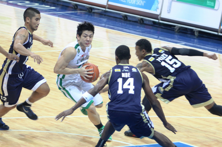 Jeron Teng (center) found it difficult to get into the lane. Guarded by the likes of Bobby Ray Parks (right) and Glenn Khobuntin (left), the rookie couldn't get into a groove, especially not with guys like Emmanuel Mbe (foreground) waiting under the basket. Jeff Venancio