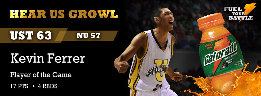 The University of Santo Tomas Growling Tigers are making a trip back to the UAAP men's seniors division basketball Finals after defeating the streaking National University Bulldogs, 63-57, Saturday at the Smart Araneta Coliseum. It is UST's first trip back to the finals since winning it in 2006. This year, the team enjoyed a twice-to-beat advantage heading into their Final Four match up against NU, which hadn't made the playoffs since 2001. Kevin Ferrer scored 17 points and limited National University star Bobby Ray Parks to only 12 points, as the second-seeded Tigers overpowered the third-seeded Bulldogs late. “Sobrang saya na second year pa lang ako, nakapasok na sa Finals”, said the lanky 6’4” forward Ferrer. The former UAAP Juniors Most Valuable Player played lockdown defense on the 6’4” Parks, who normed 21.4 PPG throughout the season. Parks took twelve shots, making only four of them and missing all his three-pointers, while Ferrer played a better counterpart, scoring 17 points on 7-of-9 shooting from the field. The Bulldogs went on run late in the fourth quarter, holding the Tigers scoreless after a three-pointer by Fortuna upped the UST lead to 59-50. Gelo Alolino abused the lane with two quick lay-ups, part of a 7-0 blast that made it a one-possession game, 59-57, but those were the last points NU scored, 2:34 left. After a time-out, Mariano took the game in his hands, did a whirl, and made a short stab to the rim to keep the lead safe at 61-57. NU fumbled their shots, and failed to get the ball to their stars Parks and Emmanuel Mbe. After one final miss by Jeoffrey Javillonar, an elated Kevin Ferrer darted to the lane for a quick lay-up just as the buzzer sounded. “Pinaghirapan ng mga bata ito. Destiny”, said UST coach Pido Jarencio.