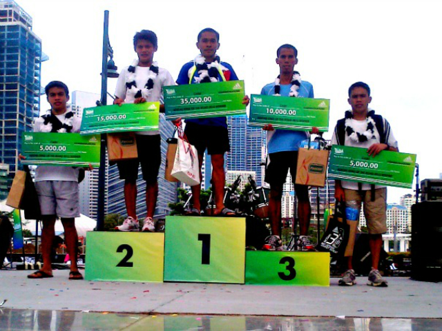 Veteran runner Eduardo Buenavista (center) won the 2012 King of the Road PHL eliminations on Sunday and will represent the country on October 28 in Singapore. Placing second was Irineo Raquia, third placer was Alley Quisay, followed by Darwin Lim for the fourth spot and Rene Desuyo as the fifth placer. Perry Legaspi