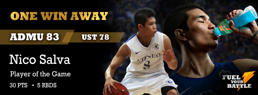(Updated 9:00pm) The Ateneo de Manila University Blue Eagles and the University of Santo Tomas Growling Tigers are proving to be a match made in hoops heaven. The top two teams of Season 75 thrilled a 20-thousand strong crowd, with UST seemingly on its way to an upset before defending four-peat champion Ateneo clawed back in the second half. But the spotlight shined brightest on Ateneo forward Nico Salva, who outdid his Finals MVP ways of last season, scoring a career-high 30 points to lift Ateneo to an 83-78 UAAP Finals game one victory over UST, Saturday at the SM MOA Arena. “In the second half, we decided to bring the ball inside. We had some very good match-ups. It worked to our favor to work in the post," said Ateneo head coach Norman Black, who improved his UAAP record in the first game of Finals series to 6-0. If Ateneo wins the next game in the two out of three Finals format, Black will end his Ateneo coaching stint with his fifth straight title. He will be coaching in the PBA next year. The Blue Eagles went on a 17-0 blitzkrieg at the start of the third quarter that demolished a six-point lead that UST had toiled to build in the first half, emerging with the lead after the third quarter. But it was Salva who kept them in the game early, and also fueled their big run, as the graduating forward scored 15 points in each half, all while abusing the defense of his counterpart Aljon Mariano. “I just want to win so I gave it my all," said Salva, who is in his last year as a collegiate player. The last time a player scored 30 or more points in the Finals was in 2008, when Rabeh Al-Hussaini dominated with 31 against the De La Salle Green Archers.