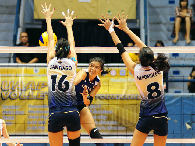 Ateneo's Alyssa Valdez challenges the defense of NU's Dindin Santiago. Photo by KC Cruz