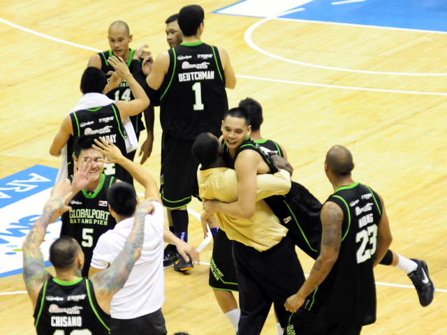 Members of GlobalPort Batang Pier celebrate their victory. Import Justin Williams lifts up Japeth Aguilar (R) in delight. KC Cruz