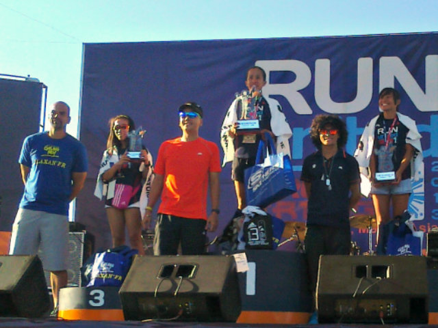 The top-three of the men's 21k race - Gregg Vincent Osorio (third from left), second-place Isidro Vildosola (second from right) and Romeo Marquez (left). With them is a Unilab official (second from left) and coach Rio dela Cruz (right). Perry Legaspi