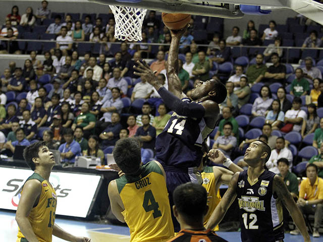 Emmanuel Mbe goes up for a score versus the defense of FEU's Carl Bryan Bruz. KC Cruz