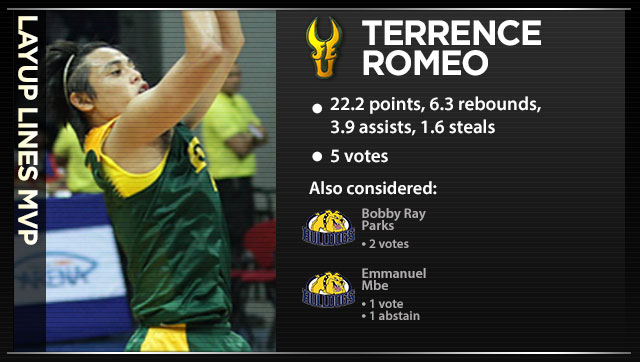 Renee - It got just a little bit scary when NU started to win without the ball in Bobby Ray Parks' hands. Then again, Parks' worth as an MVP is better measured by how improved his teammates are because of his mere presence. He's third overall in scoring, just behind machines like Terrence Romeo and Roi Sumang, while rivaling bigs at the boards (8.4) and in blocks (1.1) and point guards in assists (3.8) and steals (1.1). He is the true driving force behind NU's league-leading record.