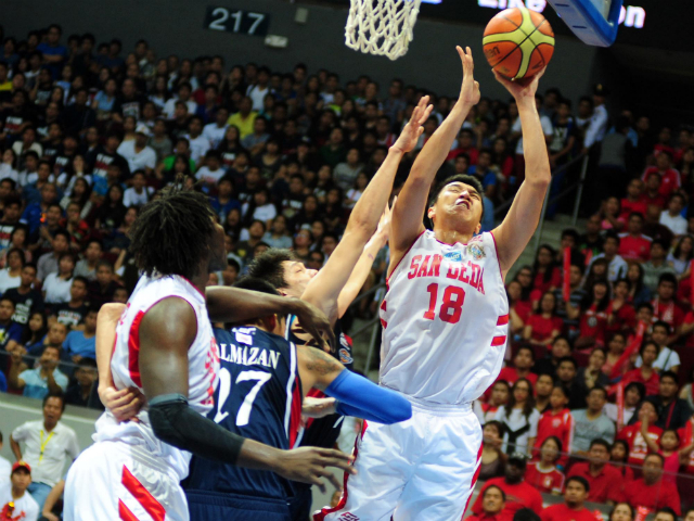 San Beda decided to run their offense through Adeogun in the third quarter, with Dela Cruz providing support from the high post. Rey Nambatac came up with five points as the Knights limped ahead, but the Red Lions duo managed to close the gap, 39-37.
