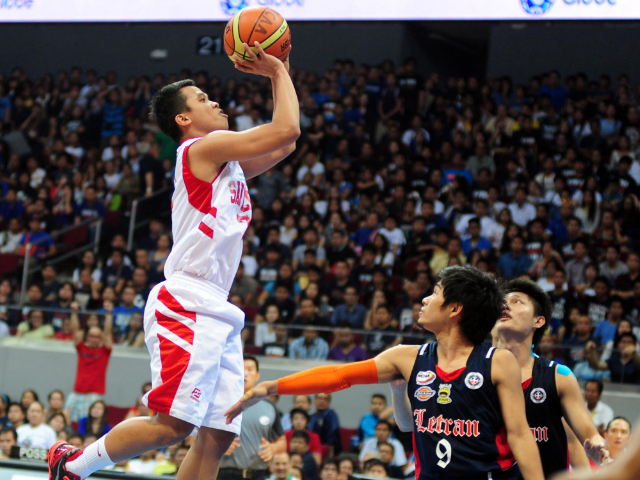 Baser Amer (L) launches a pull-up jumper over the Letran defense. KC Cruz