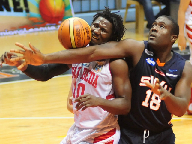 Ola Adeogun (L) and Fabrice Siewe battle for a rebound. KC Cruz
