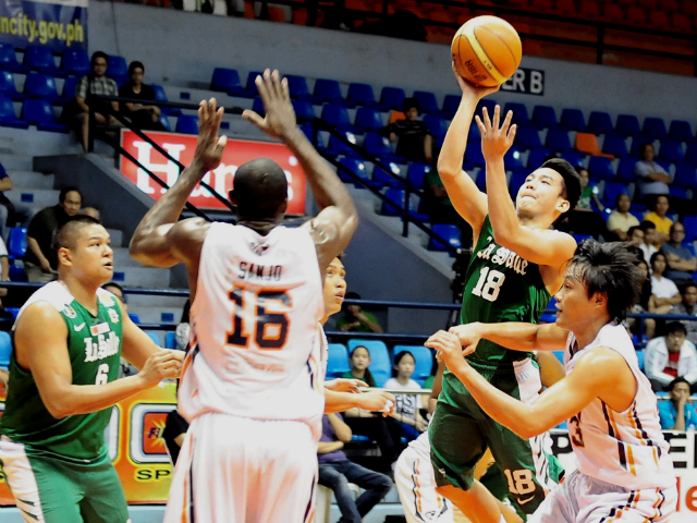 DLSU point guard Thomas Torres (18) floats one over the SWU defense. KC Cruz