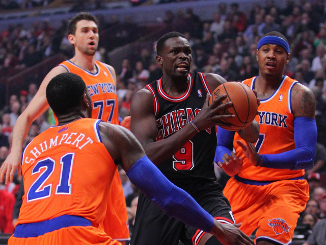 Luol Deng (C) draws a triple-team from the New York Knicks. Dennis Wierzbicki-USA TODAY Sports / Reuters