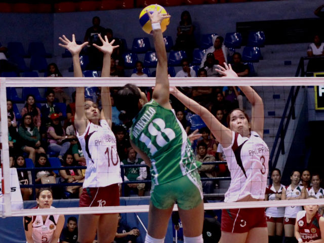 DLSU's Cydthealee Demecillo hits through UP's Alyssa Layug and Nicole Tiamson. Jeff Venancio