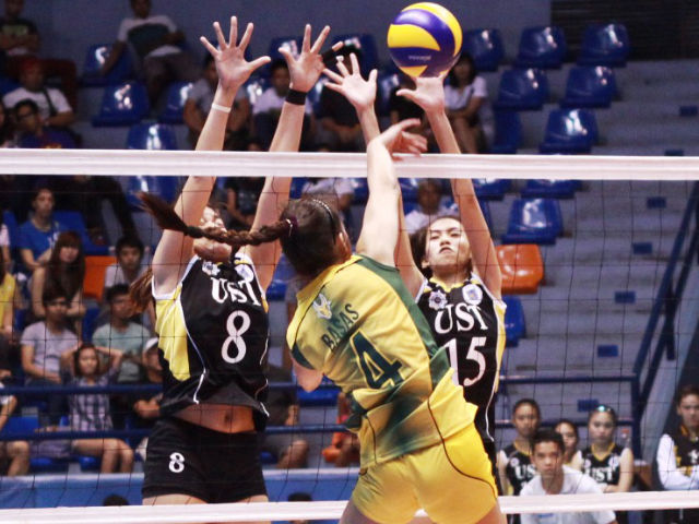 FEU's Marie Toni Basas tries to evade the blocking tandem of Carmela Tunay and Jessey de Leon of UST. Jeff Venancio