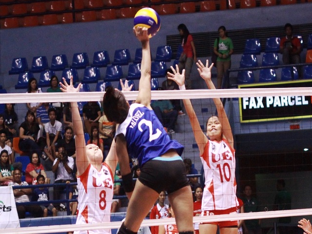 Madel Gavarra and Chello Ramos of UE struggle to contain Ateneo's Alyssa Valdez. Jeff Venancio