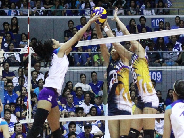 Jaja Santiago and Aiko Urdas of NU challenge Ateneo's Alyssa Valdez. Jeff Venancio