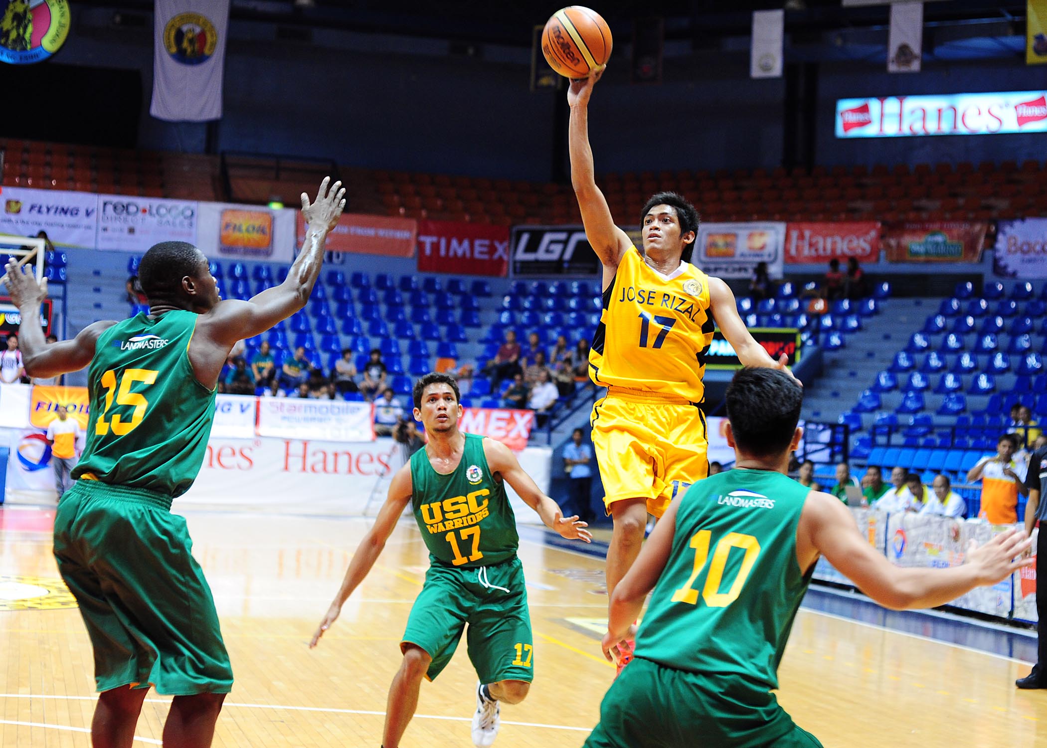 Jaycee Asuncion of JRU goes for a one-hand shot surrounded by three USC players. KC Cruz