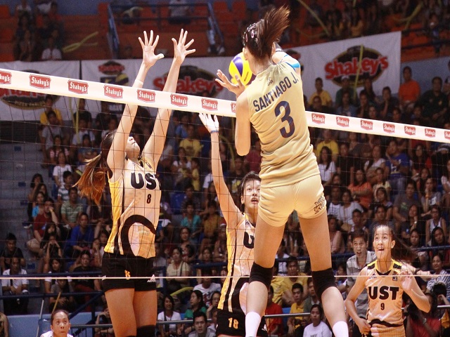 The UST defense reacts late to a Jaja Santiago attack. Jeff Venancio