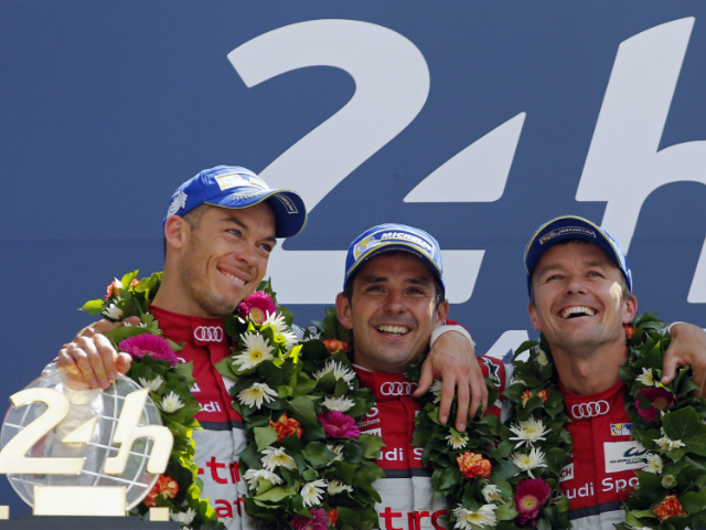 Audi R18 E-Tron Quattro Number 2 drivers Andre Lotterer of Germany, France's Benoit Treluyer and Marcel Fassler of Switzerland, celebrate on the podium after winning the Le Mans 24-hour sportscar race. Stephane Mahe / Reuters