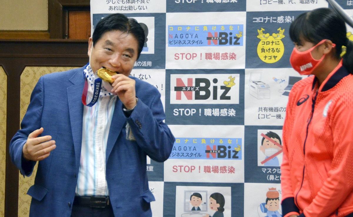 At an event held last week to celebrate Miu Goto's achievement at the Tokyo 2020 Games, Takashi Kawamura, mayor of central Japan's city of Nagoya, pulled down his mask and put her gold medal between his teeth.