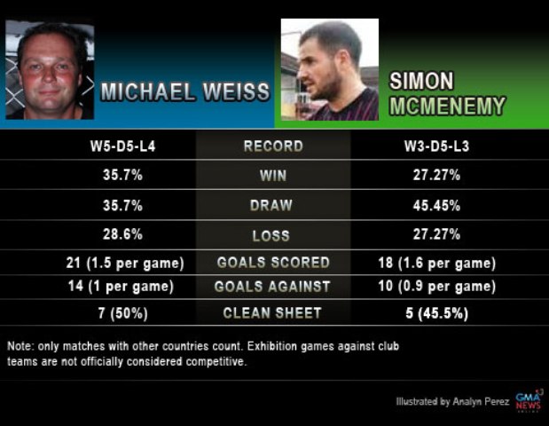 Head-to-head With clean sheets in almost half the games the defensive priority, "parking the bus" was successful under McMenemy. While they played minnows in their first few games, winning 5-0 against Macau and East Timor, the Suzuki Cup results were impressive, an unbeaten group stage and conceding three goals in five games against some of the best nations in Southeast Asia throughout. Weiss, compared to McMenemy's style of defending deep and in numbers, is transitioning to a more attractive, attacking style, which led to the thrashings of Sri Lanka, Bangladesh and Nepal. Given both Coaches took over at different points in Philippine football development their styles fit their context: McMenemy defended a lot to gain draws while Weiss built on that success to establish the team as contenders. A lot of the difference has to do with expectations. The 2010 Suzuki Cup semifinals were such a shock that this is what McMenemy is remembered for with Weiss inheriting the 34-year-old former mentor's greatest success. That is somewhat unfair as both coaches have been successful. Formations and the style of play all depends on the players you've got and what you're trying to achieve. Their records don't mean one is better than the other, it means they were looking to achieve different things.