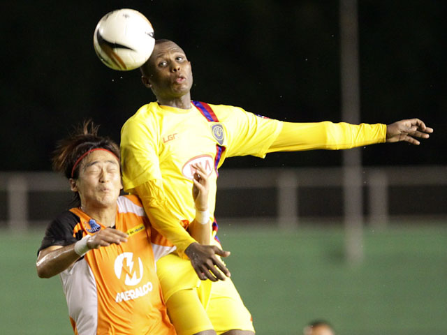 Izzo El-Habib of Global FC (R) goes for a header against a Meralco Sparks player. The striker scored one of his side's two goals in the win. Mark Cristino