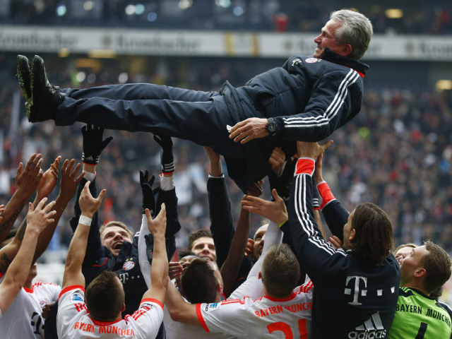 Bayern Munich celebrate their Bundesliga championship by throwing coach Jupp Heynckes into the air. Kai Pfaffenbach / REUTERS