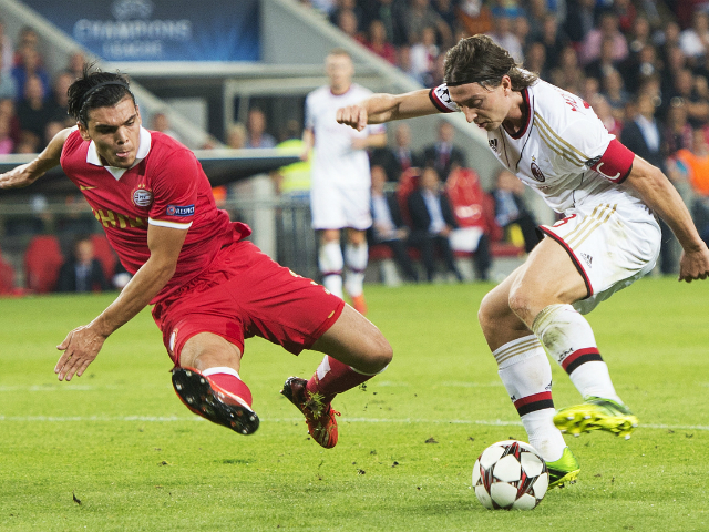 PSV Eindhoven's Karim Rekik (L) challenges AC Milan's Riccardo Montolivo during their Champions League match. Toussaint Kluiters/United Photos/Reuters