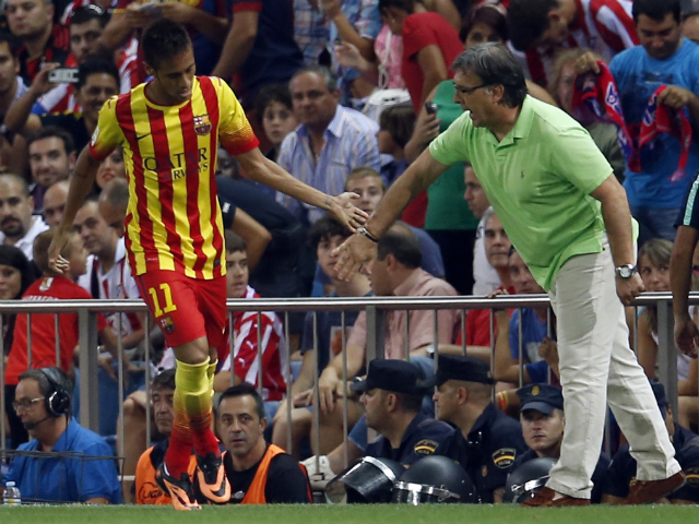 Barcelona's Neymar (L) is congratulated by his coach Gerardo "Tata" Martino after scoring a goal against Atletico Madrid. Sergio Perez / Reuters