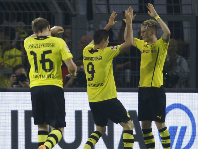 Robert Lewandowski (C) celebrates with Marco Reus (R) after teaming up for the game's sole goal. Ina Fassbender / Reuters
