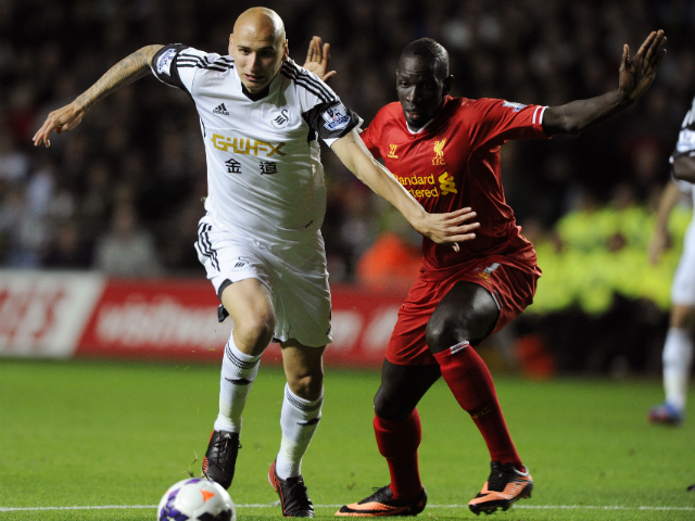 Swansea City's Jonjo Shelvey (L) passes Liverpool's Mamadou Sakho. Rebecca Naden / Reuters