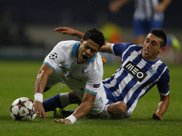 Zenit St Petersburg's Hulk (L) is tackled by Porto's Hector Herrera. Rafael Marchante / Reuters