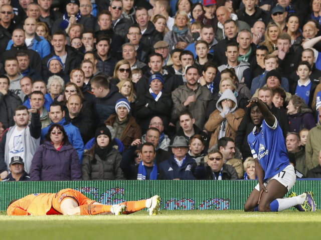 Tottenham Hotspur's goalkeeper Hugo Lloris (L) lies injured after a collision with Everton's Romalu Lukaku (R). Lloris later shook off the injury and stayed in the game. KC Cruz