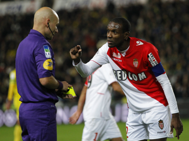 AS Monaco's Eric Abidal reacts as referee Tony Chapron shows a yellow card during their French Ligue 1 soccer match. Stephane Mahe / Reuters