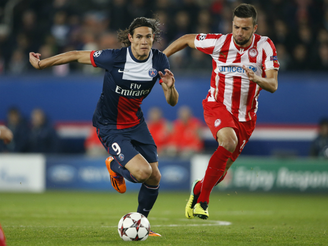 Paris St-Germain's Edinson Cavani (R) challenges Olympiakos' Piraeus Andreas Samaris. Charles Platiau / Reuters
