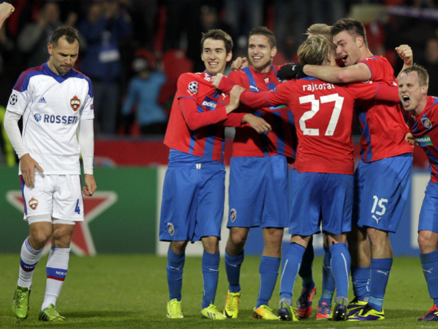 CSKA Moscow's Sergei Ignashevich (L) walks past Viktoria Plzen's players celebrating their entrance to the Europa League after a 2-1 win. David W Cerny / Reuters