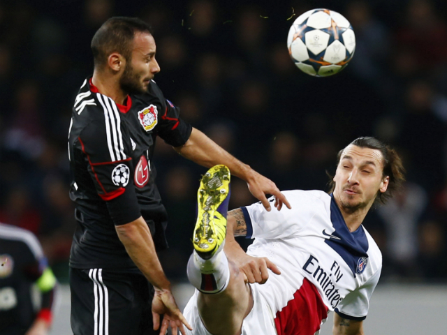 Bayer Leverkusen's Oemer Toprak (L) challenges Paris St Germain's Zlatan Ibrahimovic during their Champions League match. Ralph Orlowski / Reuters