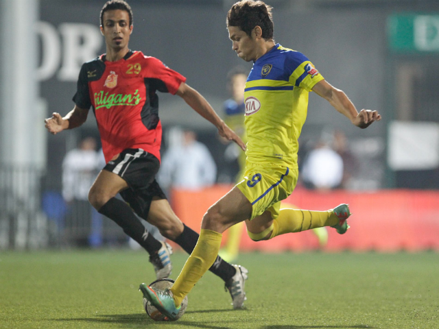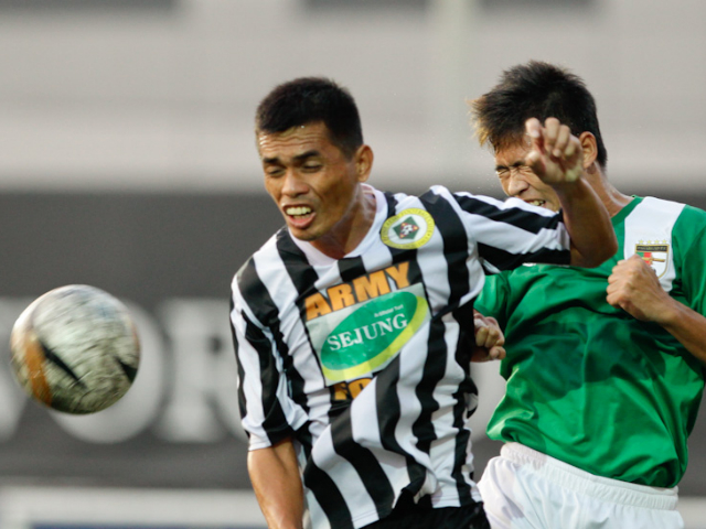 Army GTI FC's Nestorio Margarse (L) vies for a header against a Pasargad player. Margarse drew first blood at the 11th minute for Army-GTI. Mark Cristino
