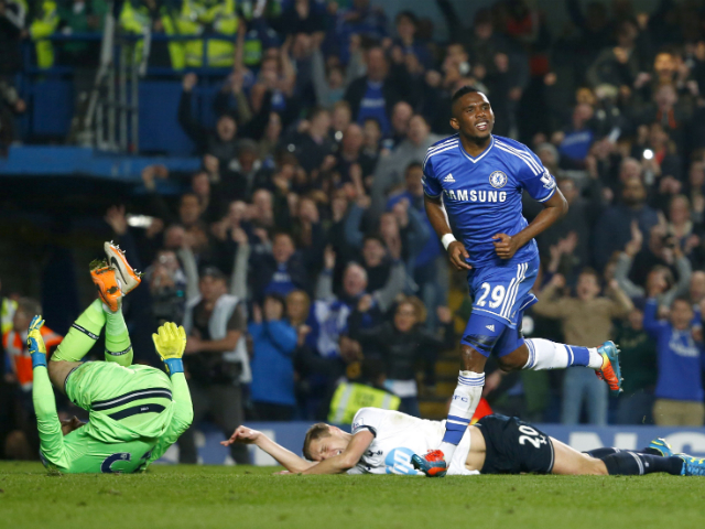 Chelsea's Samuel Eto'o (R) celebrates scoring a goal as Tottenham Hotspur's Michael Dawson (C) and Hugo Lloris fall short of stopping him. Eddie Keogh / Reuters