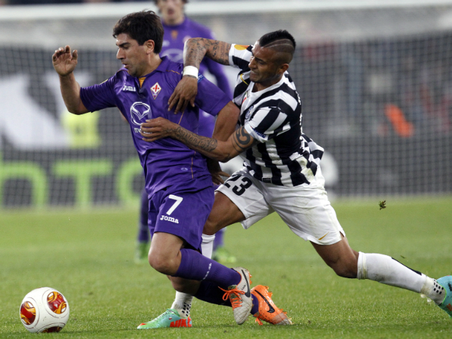 Juventus' Arturo Vidal (R) fights for the ball with Fiorentina's David Pizarro during their Europa League match. Alessandro Garofalo / Reuters