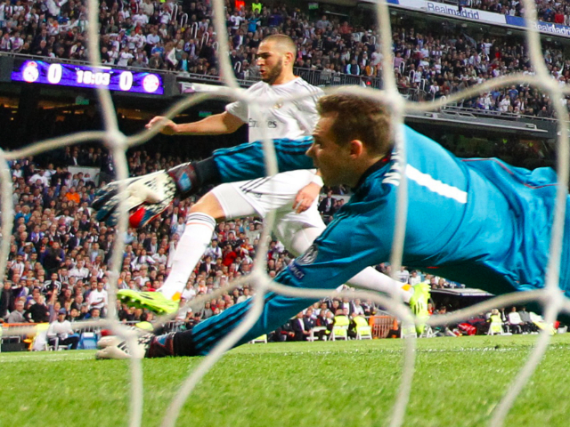 Real Madrid's Karim Benzema (L) scores against Bayern Munich's goalkeeper Manuel Neuer. Laurence Kesterson / Reuters