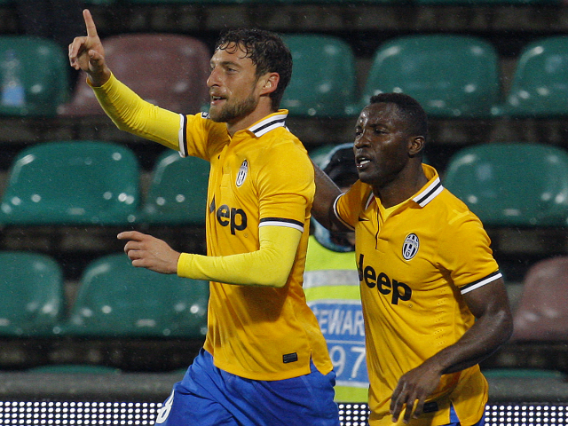 Juventus' Claudio Marchisio (L) celebrates with teammate Kwadwo Asamoah after scoring a second goal against Sassuolo. Alessandro Garofalo / Reuters