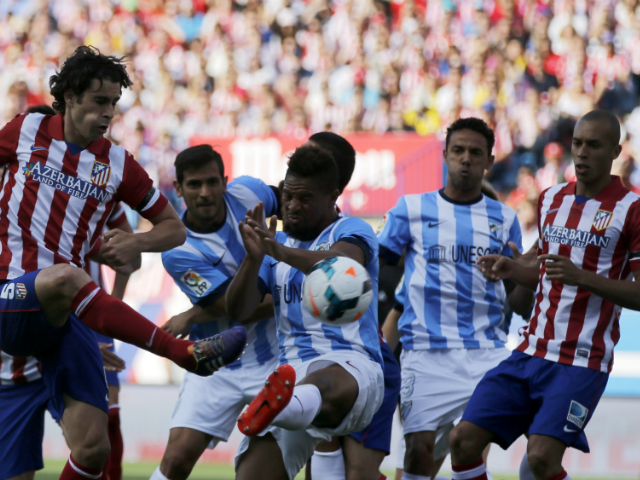 Atletico Madrid's Tiago (L) kicks the ball against Malaga. Sergio Perez / Reuters