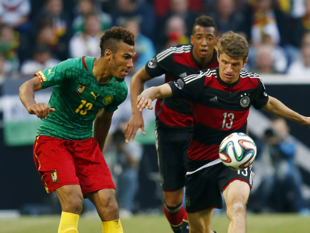 Germany's Thomas Mueller (R) challenges Cameroon's Eric Choupo-Moting (L). Ralph Orlowski / Reuters