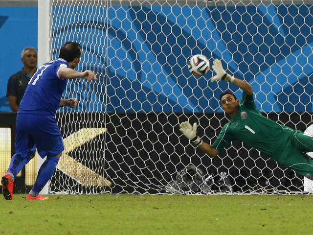 Costa Rica's goalkeeper Keilor Navas makes a save against Greece's Theofanis Gekas (L). Damir Sagolj / Reuters