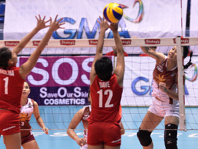 Angelie Tabaquero (R) of Cagayan Valley gets one over the defense of Xinia Molina (L) and Kristine Dave of the PNP. Jeff Venancio