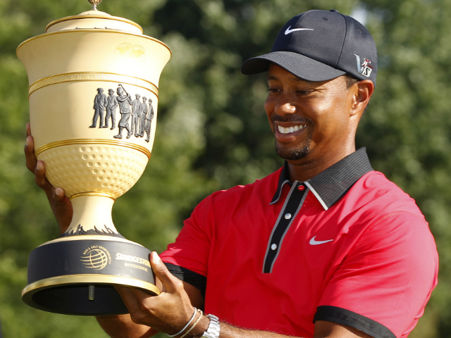 Tiger Woods of the U.S. holds up his trophy after winning the WGC-Bridgestone Invitational golf tournament. Matt Sullivan / Reuters