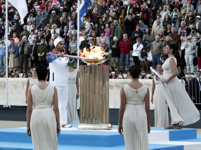 Greek figure skater Panagiotis Markouzios lights an altar with an Olympic torch of the Sochi 2014 Winter Games during a handover ceremony at the Panathenean stadium in Athens. Yorgos Karahalis / Reuters