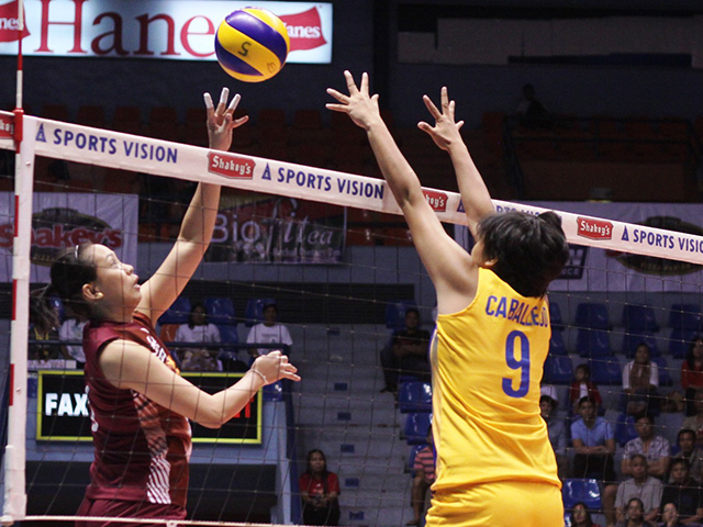 Cagayan's Aiza Maizo (L) hits one over the outstretched arms of Air Force's Judy Ann Caballejo. Jeff Venancio