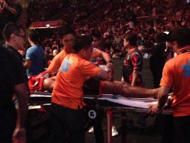 Paramedics wheel Filipino fighter Rene Catalan out of the arena following his loss. Carlo Pamintuan, GMA News